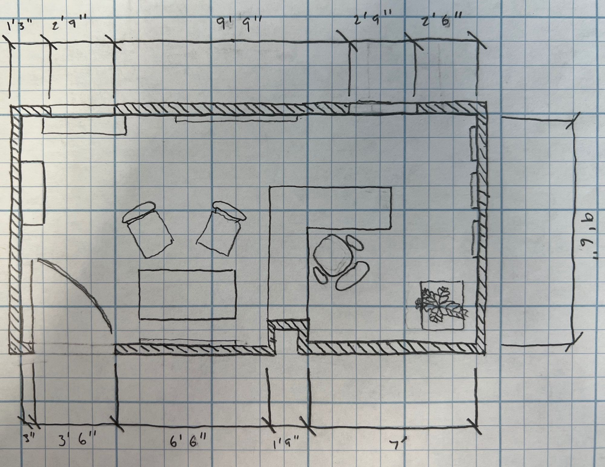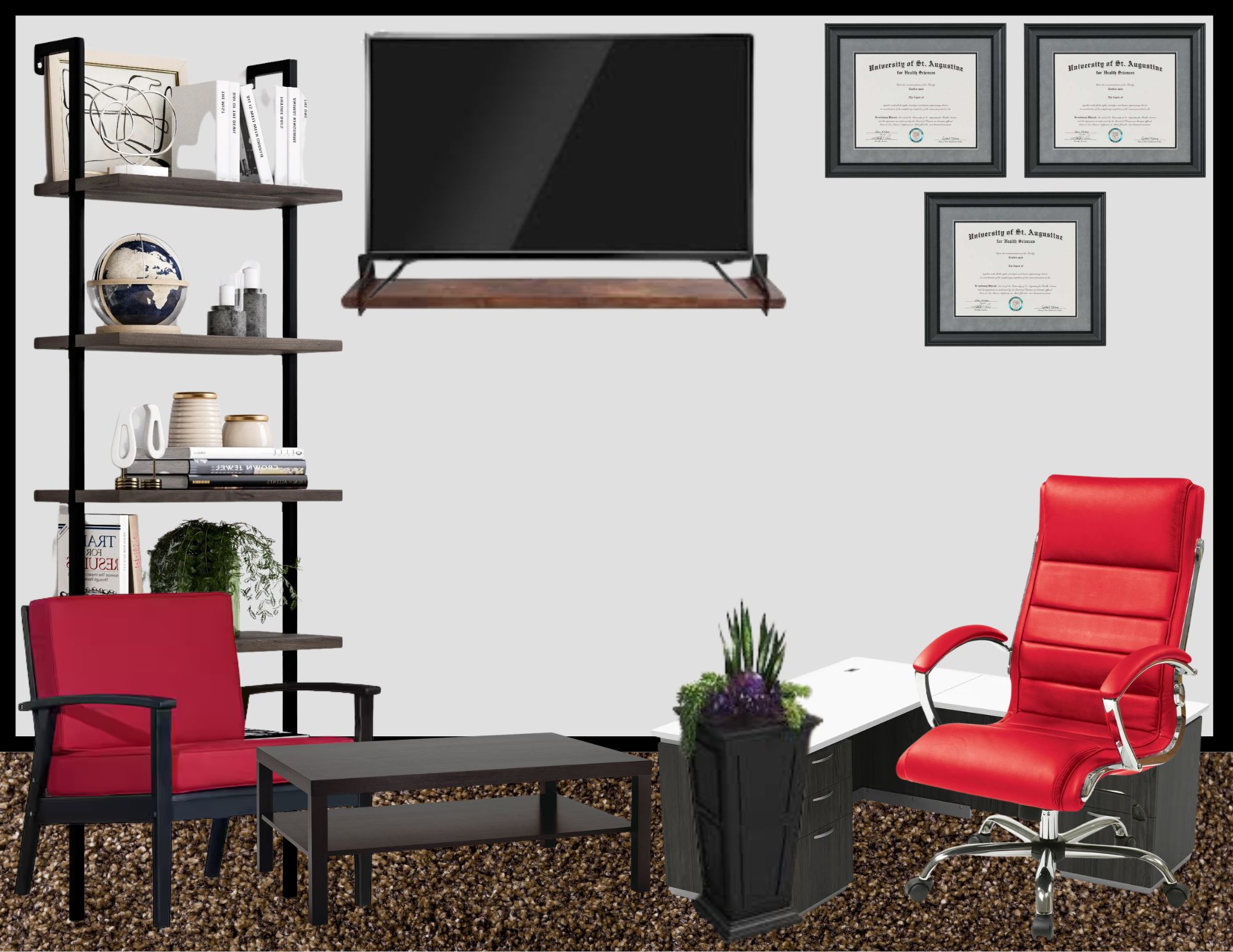 End Product – The redesigned office feels modern, comfortable, and full of personality. The new layout opens up the space, making it easier to move around and giving everything a more natural flow. The L-shaped desk now takes center stage, paired with a bold red office chair that really stands out. Two matching red guest chairs create a cozy sitting area around a sleek black coffee, adding both style and function. A tall bookshelf displays books, decor, and a few personal touches, giving the room character without feeling cluttered. Framed diplomas and a mounted TV tie it all together, creating a space that looks professional but still feels warm, inviting, and uniquely personal.